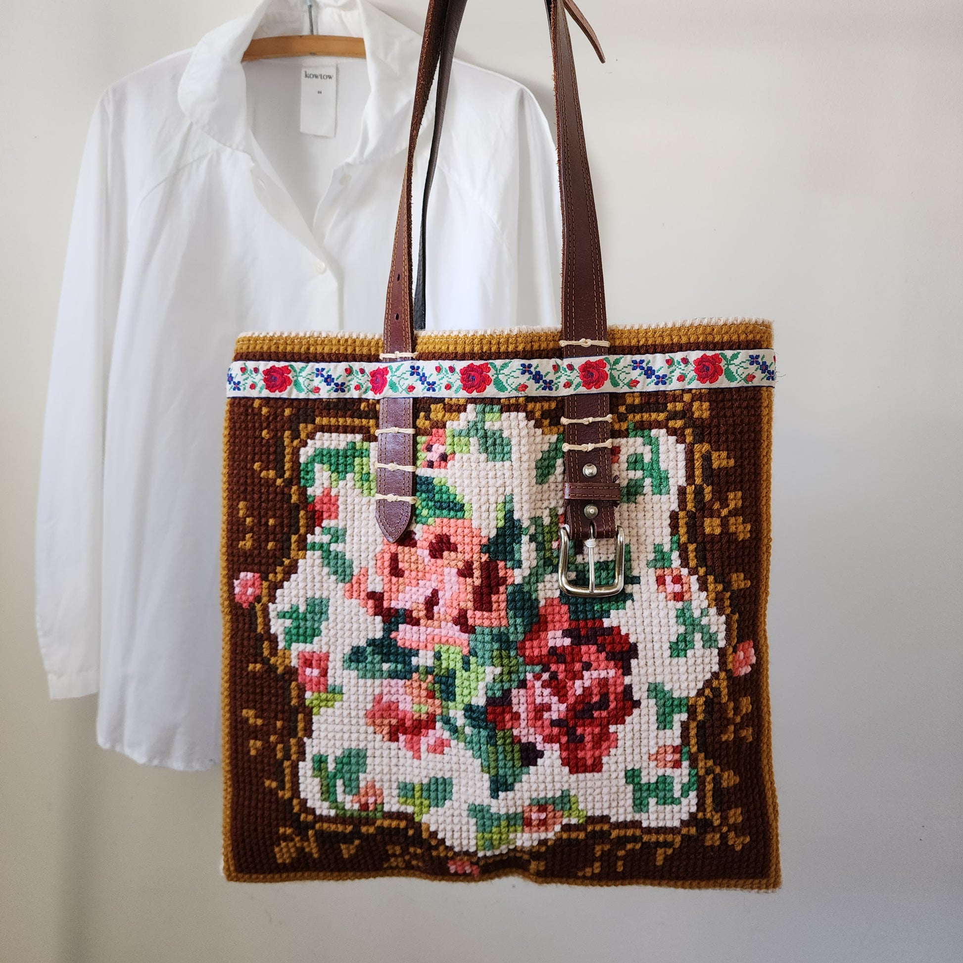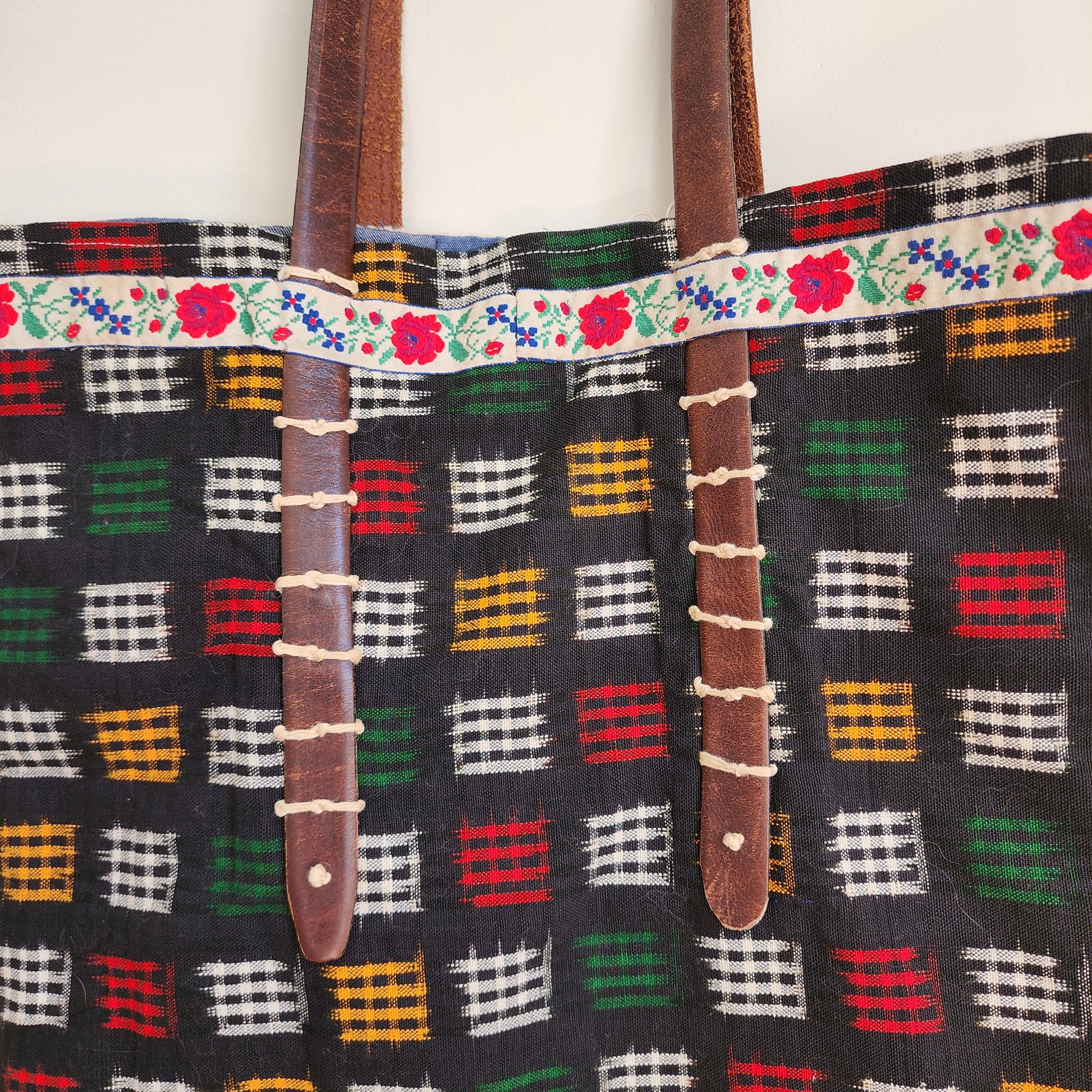 These tapestry tote bags are made of repurposed tapestries and haberdashery with authentic Indian ikat fabric backings and chambray linings.